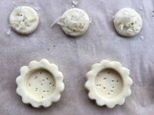 - Listnato testo odvijemo in poravnamo na peki papirju. Z modelom izrežemo 45 krogov. 15 jih shranimo, preostalim 30 pa z manjšim modelom izrežemo sredino, da dobimo kolobarje. Na vsakega izmed celih krogov naložimo dva kolobarja in rahlo stisnemo. Dno košarice nekajkrat prebodemo z vilico. Izrezane sredine pečemo zraven, če jih bomo uporabili kot pokrovčke.