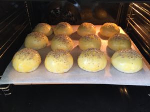 - Rumenjak zmešamo z žlico mleka in z mešanico premažemo bombetke po zgornji polovici. Potresemo s sezamom in pečemo na 200 stopinj C 15-20 minut.