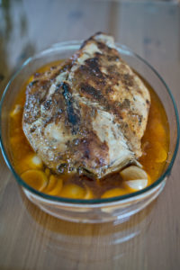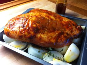 - Pečico segrejemo na 140 stopinj C, pekač rahlo namastimo z olivnim oljem, na dno damo narezano čebulo, nanjo pa vejice timijana, ki smo jih shranili (brez listov; če jih nimate, po čebuli potresete malo suhega timijana). Na vse to položimo marinirano meso. Prvo uro pečemo odkrito, nato pa pekač pokrijemo s folijo in pečemo še 5 ur. V tem času ni potrebno mesa polivati s sokovi ali jemati pekača iz pečice - samo uživamo v prostem času 🙂
