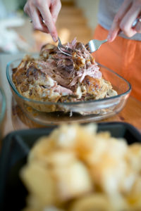 Meso se peče 6 ur (lahko tudi dlje, na nekoliko nižji temperaturi), nato dobro pokrito počiva še približno eno uro. Po počitku ga z dvema vilicama natrgam na željeno velike kose in meso pustim počivati v soku, ki se je natekel med pečenjem, da postane še bolj sočno. Fenomenalna je tudi čebula, ki se je pekla oziroma kar kuhala v mesnem soku.