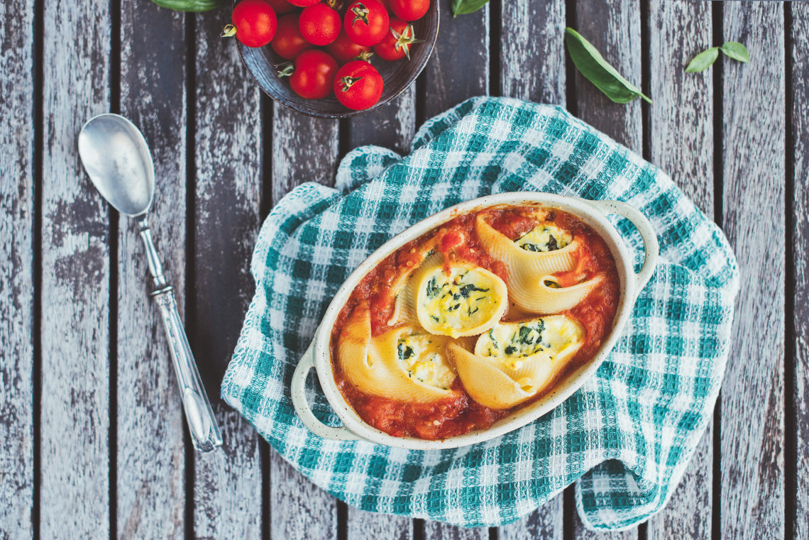 - In medium bowl mix spinach, ricotta, mozzarella, egg, basil, salt and pepper. Stuff your pasta with a generous amount of filling and place them in a baking dish you’ve prepeared in a previous step.