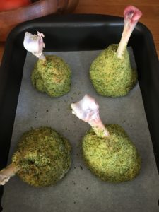 - Za paniranje si v posode pripravimo moko, razžvrkljano jajce in zelene drobtine. Krače vzamemo iz vrečke, pustimo trenutek, da odteče odvečni pinjenec in jih eno za drugo povaljamo v moki, jajcu in nazadnje v zelenih drobtinah. Z roko rahlo pritisnemo drobtine na meso, da se oblikuje lepa skorjica.