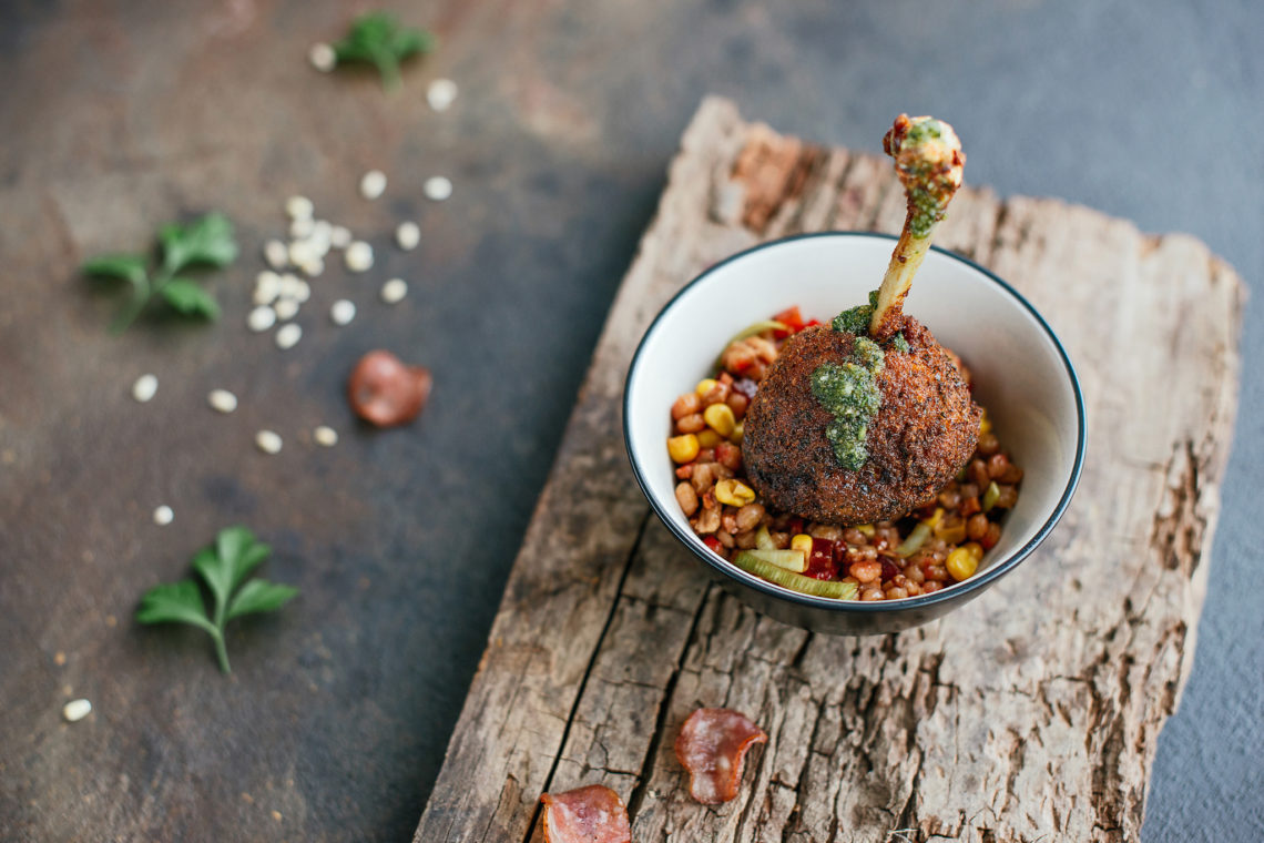Sladko in sončno meso ocvrtega piščančjega bedra, ki se skriva v ovoju drobtin s peteršiljem, prekajeno papriko in parmezanom, svežino pa mu doda ješprenova solata z balzamikom in bučnim oljem, barvno zelenjavo, zemeljsko rdečo peso in hrustljavimi kockami kranjske klobase.