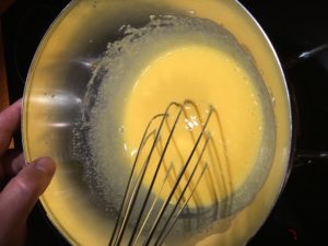 - Nad vodno kopeljo v stekleni posodi z metlico mešamo rumenjake, sladkor in žlico mleka približno 10 minut, da se rumenjaki skuhajo in zgostijo ter dobimo gosto, gladko, svetlo maso. Pazimo, da temperatura ni previsoka, da rumenjaki ne zakrknejo. Maso odstavimo in pustimo, da se popolnoma ohladi.
