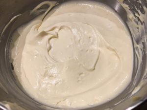- Ohlajeno jajčno maso preložimo v čisto posodo ter vanjo dobro vmešamo Mascarpone, nato pa dodamo še smetano in vse skupaj nežno zmešamo, da dobimo gladko gosto jajčno kremo.